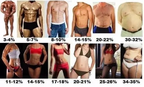 看看下边一图,明显可以感觉到,体脂率越低,肌肉越紧密,一般而言,男性在 14 ~ 24%,女性在 21 ~31% 的范围内,都算比较健康。