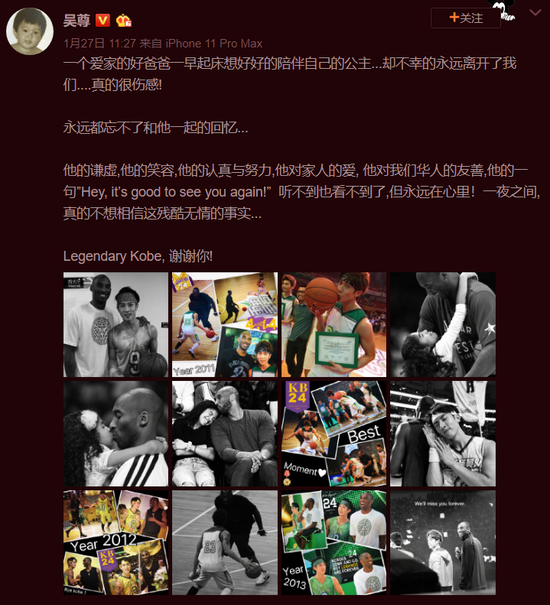 除了乔丹,吴尊也非常喜欢科比。2011年,两人在某品牌举办的篮球表演赛上同台。科比逝世后,吴尊晒出两人合影缅怀黑曼巴;追思会当天,他又在微博上发长文悼念:“之前,乔丹退役让我远离了篮球;现在,科比离世激励我再次回到球场,感恩生命中有他俩的出现。”