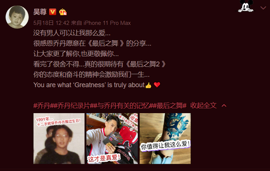 作为娱乐圈中著名的乔丹死忠,演员吴尊发微博向偶像致敬。他晒出多年来收藏的乔丹球衣,并写道:“没有男人可以让我那么爱。看完了很舍不得,真的很期待有《最后之舞2 》,你的态度和奋斗精神会激励我们一生。”
