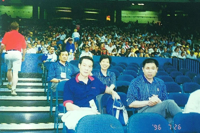 ▲1996年,马连保(右)在第26届奥运会上观看篮球比赛(左起:陈道宏、钟添发、胡士琳
