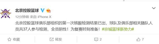 北京控股篮球队官方写到:“北京控股篮球俱乐部组织的第一次核酸检测结果已出,球队及俱乐部相关随队人员共37人参与检测,全员阴性!为复赛时刻准备!”