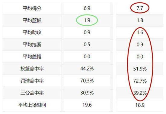 首先在这组数据主要对比的是两名球员在赛季的得分、篮板、助攻、抢断、盖帽这5项显性数据以及投篮命中率、罚球命中率以及三分命中率这3项隐性数据,在总共8项的数据对比中,丁彦雨航仅仅在场均篮板球数量中击败了陈培东,也仅仅是以0.1次篮板球的微弱优势赢了陈培东,但是陈培东毕竟位置是后卫,距离篮筐更远,而丁彦雨航作为小前锋肯定更接近抢到篮板球。