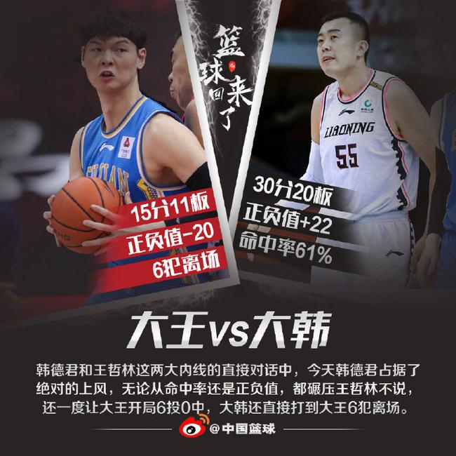 CBA复赛第二阶段继续进行,备受瞩目的辽粤大战,辽篮以121-101大胜福建男篮20分之多拿下5连胜。此役最精彩的内线对决,也分出了胜负:轰下30分20篮板两项全场最高、也是本赛季个人最高数据的韩德君,几乎碾压6犯离场仅得到15分11篮板的王哲林。