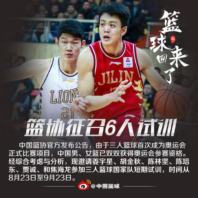 北京时间8月15日,中国篮协官方发布公告,由于三人篮球首次成为奥运会正式比赛项目,中国男、女篮已双双获得东京奥运会参赛资格。经综合考虑与分析,现邀请姜宇星、胡金秋、陈林坚、陈培东、贾诚和焦海龙参加三人篮球国家队短期试训,时间从8月23日至9月23日。