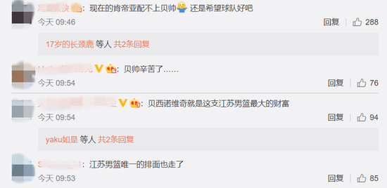 在江苏队官宣的微博下面,大家集体感谢贝西洛维奇,出现了很多这样的评论:“感恩贝帅,是咱们配不上您。贝西诺维奇就是这支江苏男篮最大的财富。江苏男篮唯一的排面也走了……”可见贝帅多受球迷的喜爱。
