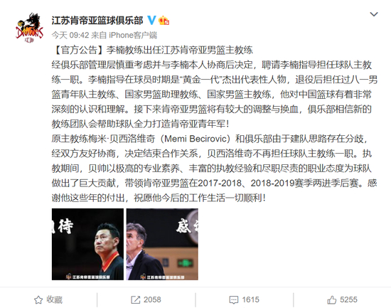 今年CBA的休赛期只有两个月,所以重磅新闻一个接一个!北京时间8月19日,江苏肯帝亚篮球俱乐部官方宣布:前中国男篮主帅李楠出任球队主教练。原主教练贝西洛维奇和俱乐部在建队思路上存在分歧,经双方友好协商,决定结束合作关系。