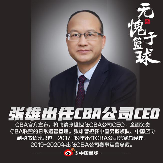 9月7日,中篮联(北京)体育有限公司(简称“CBA联盟”)宣布,经董事长姚明提名,CBA联盟董事会批准,聘请张雄先生担任CBA联盟首席执行官,全面负责CBA联盟的日常运营管理。