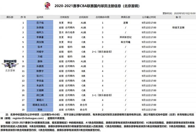 北京时间09月10消息,CBA官方更新北京男篮球员注册信息表,休赛期刚刚结束租借回归广州的范子铭,转会至北京男篮,剩余1年新秀合同。