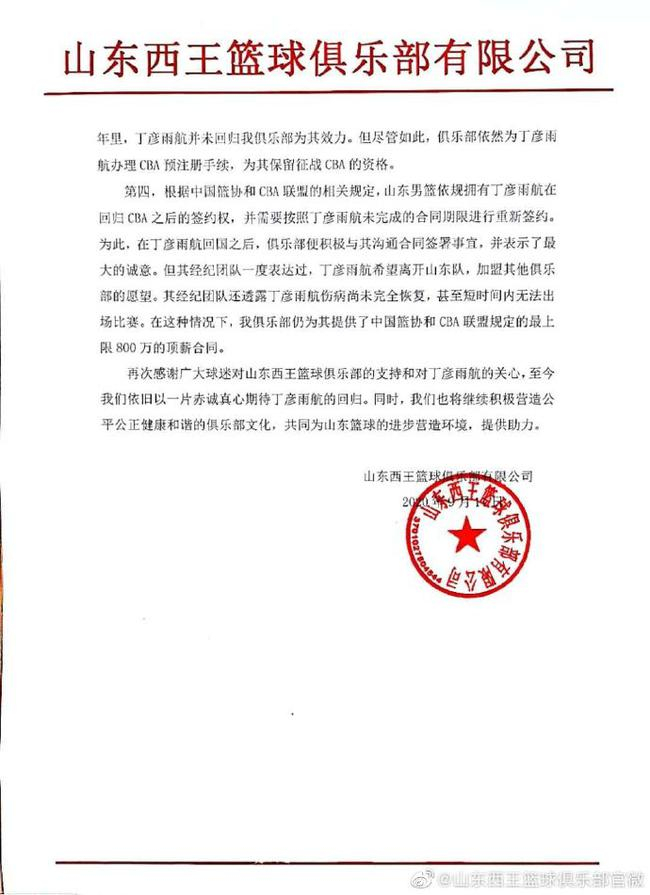 而且声明最后强调,山东队有丁彦雨航回归CBA之后的签约权,并给他提供了一份800万的顶薪合同。