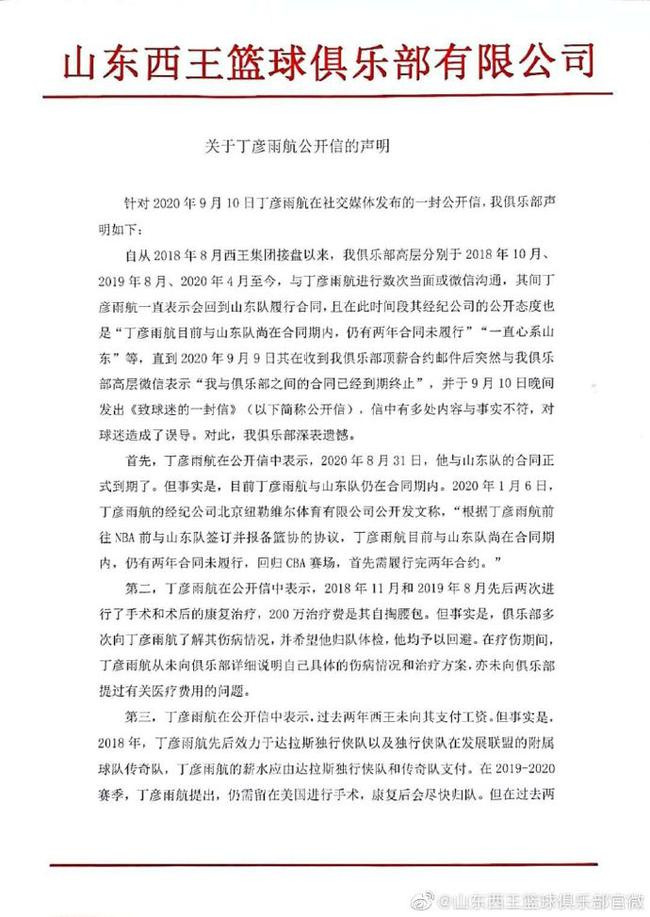 北京时间9月11日,昨日晚间,丁彦雨航在微博发布长信,谈到了自己与山东队之间的问题,他表示自己已经与山东队合同到期,而在自己养伤2年期间,自费200万,山东队并没有承担医疗费用,且他们并没有支付自己工资。今天,山东男篮官方发布声明,对此事进行了回应。