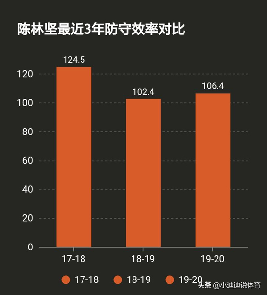其实陈林坚身体条件并不是很差,身高198CM,体重95KG,移动敏捷,弹跳能力也尚可。但是从他进入联盟的第一年开始,他在防守端的表现就成为了他最大的缺点,这也是他在去年世界杯上被弃用的主要原因吧。本赛季陈林坚在防守端的表现依然糟糕,整体防守效率只有106.4,排在联盟第191位,应该是比较靠后的位置了。作为身高接近2米的小前锋,本赛季陈林坚场均盖帽只有0.1次,几乎是没有盖帽输出。场均篮板为3.8个,排名第65名,场均助攻1.8次,排名64名,还算中规中矩,说得过去。下面我把陈林坚最近3年的防守效率做一个对比。(备注:防守效率得分越低,表示防守效果越好)