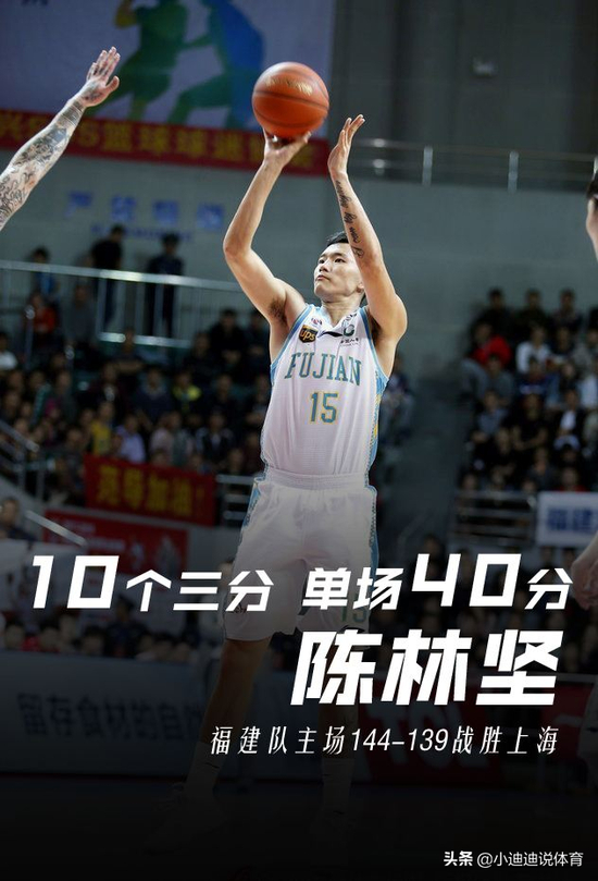 后面的几个赛季,陈林坚的表现也是稳步提升。这里不得不说一下他的封神之战。2017-2018赛季,福建主场迎战上海队的比赛中,陈林坚单场投进10个3分球,3分球14投10中,2分球7投5中,砍下全场本土球员最高得分40分,创下个人职业生涯单场得分新高,让球迷一度在他身上看到了曾经联盟的三分王朱芳雨的影子。本赛季在福建队做客天津队的比赛中,陈林坚更是再一次刷新了个人得分新高,全场比赛2分球15投12中,3分球5投4中,罚球12罚10中,一举砍下全场最高得分46分。从这2场典型比赛就可以看到陈林坚是一个拥有超强爆发得分能力的选手,他精准的投射和超强的无球进攻能力,让人们看到了他身上的无限潜力。