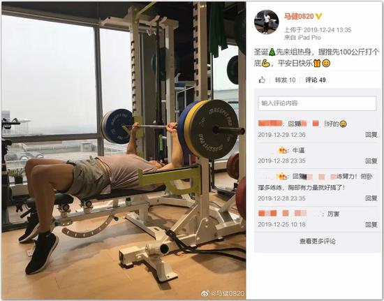 再来说说卧推。前中国男篮主帅宫鲁鸣曾透露,大部分球员的卧推重量达不到100公斤,而女排主攻手张常宁都能达到120公斤。巅峰马健的卧推数据显然碾压现役球员,即使如今已年过50,健身房依然100公斤打底!