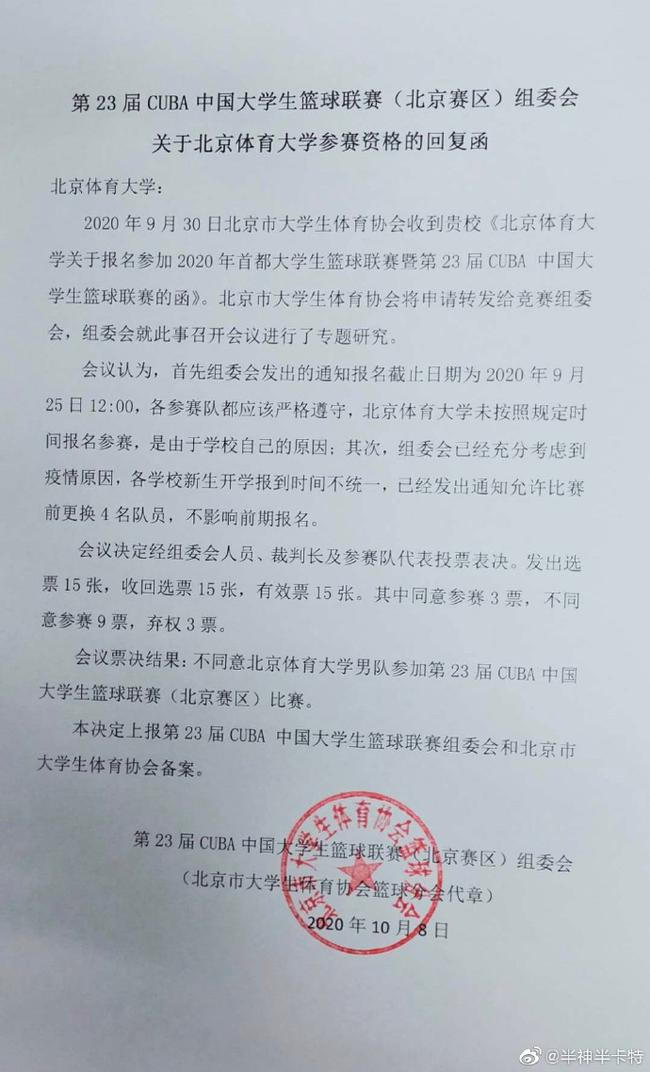 北京时间10月9日消息,据体育博主@半神半卡特 透露,北体大男篮重新参加本届CUBA的申请被驳回,原因是未在规定时间内完成报名。