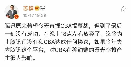 而事实上,腾讯一直也没有放弃,据资深媒体人苏群透露,直到揭幕战前一个小时,腾讯仍然希望直播本赛季CBA。可直到最后时刻,CBA依旧无人拍板,于是就有了,腾讯无法直播,咪咕又体验较差,球迷愤怒开骂的局面。