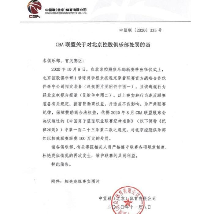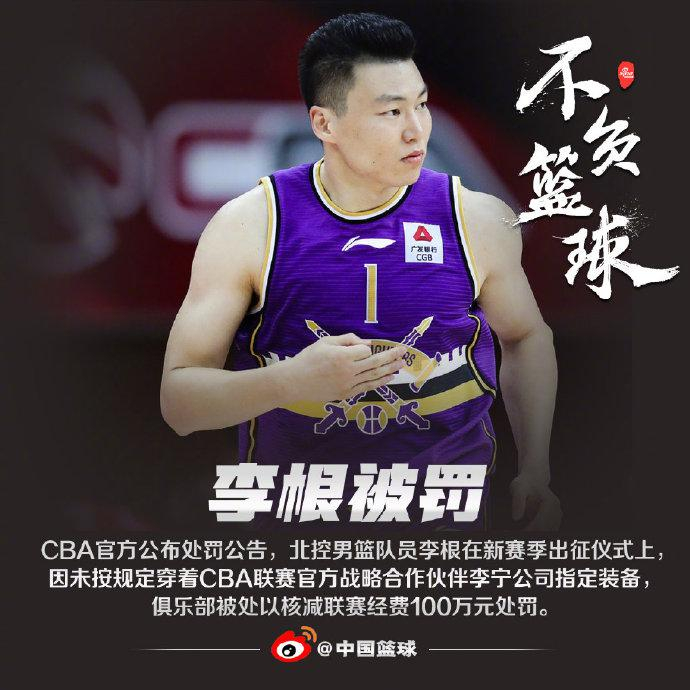 CBA官方公布处罚公告,北控男篮队员李根在新赛季出征仪式上,因未按规定穿着CBA联赛官方战略合作伙伴李宁公司指定装备,俱乐部被处以核减联赛经费100万元处罚。
