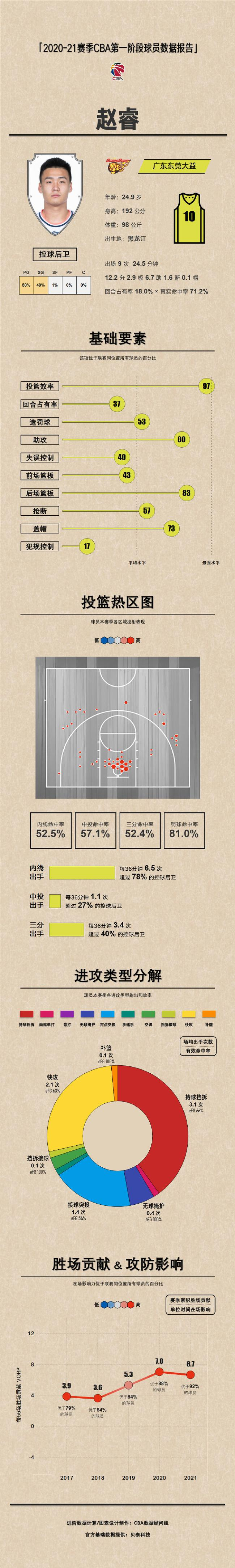 [赵睿]:强壮的双能卫,擅长快攻开阔空间终结,篮下命中率出色。打挡拆时喜欢传球,很少出手中距离,能命中空位三分。全面的防守人,能盯多个位置,非常拼命。