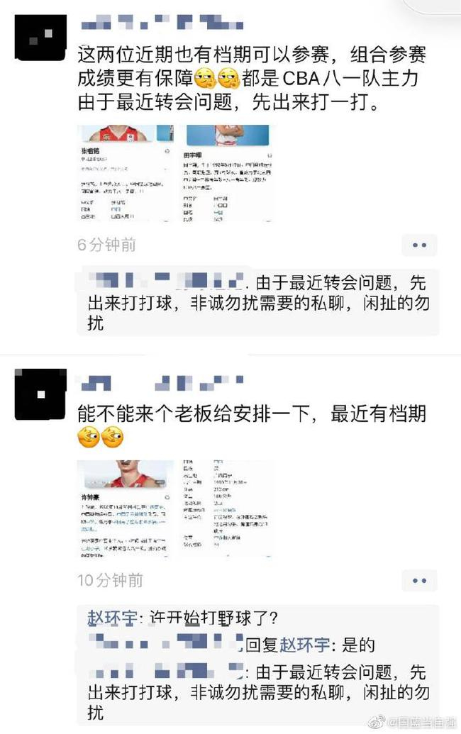 赵环宇在个人微博发文写道:“‘八一队员转战野球场寻找机会’近日,有野球经纪人在朋友圈挂出许钟豪、田宇翔和张祖铭三位八一队员的百科页面,称“有档期”,欢迎洽谈。据我了解,八一男篮目前已经处于半“放羊”状态,队员各练各的,已经有两个多月没有对抗训练。
