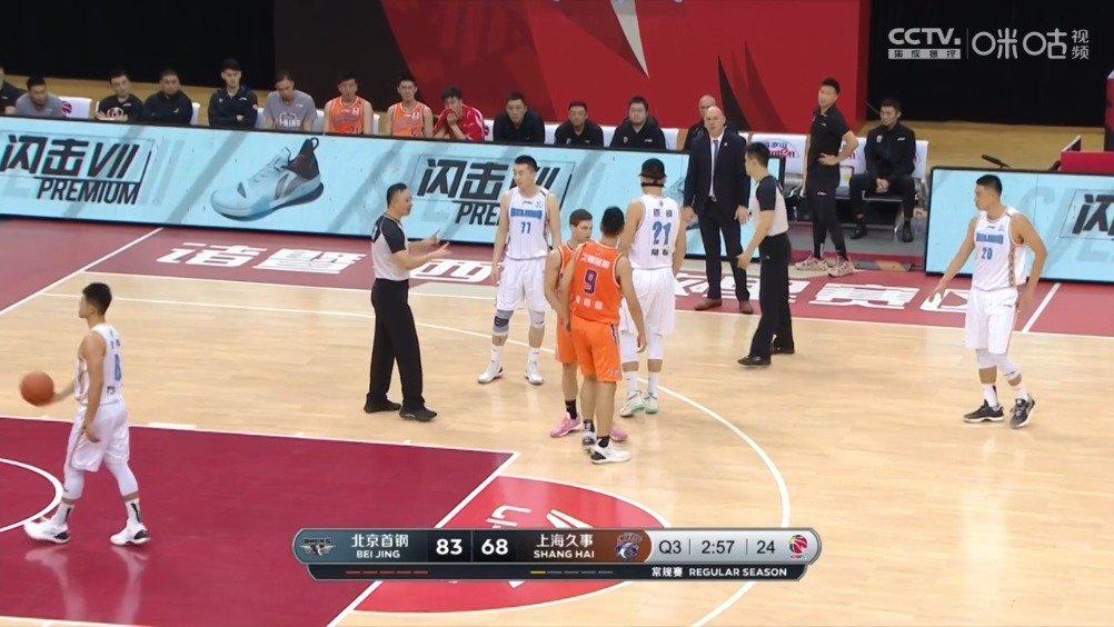 北京对阵上海,比赛第三节,王骁辉在争抢篮板时肘击上海队鞠明欣,鞠明欣也做出一个挥臂还击的动作,裁判判罚双方违体犯规。