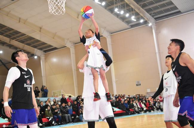 艺人球员伍志勋将小球员李学英高高举起,投进了她在本场比赛中的第一球!