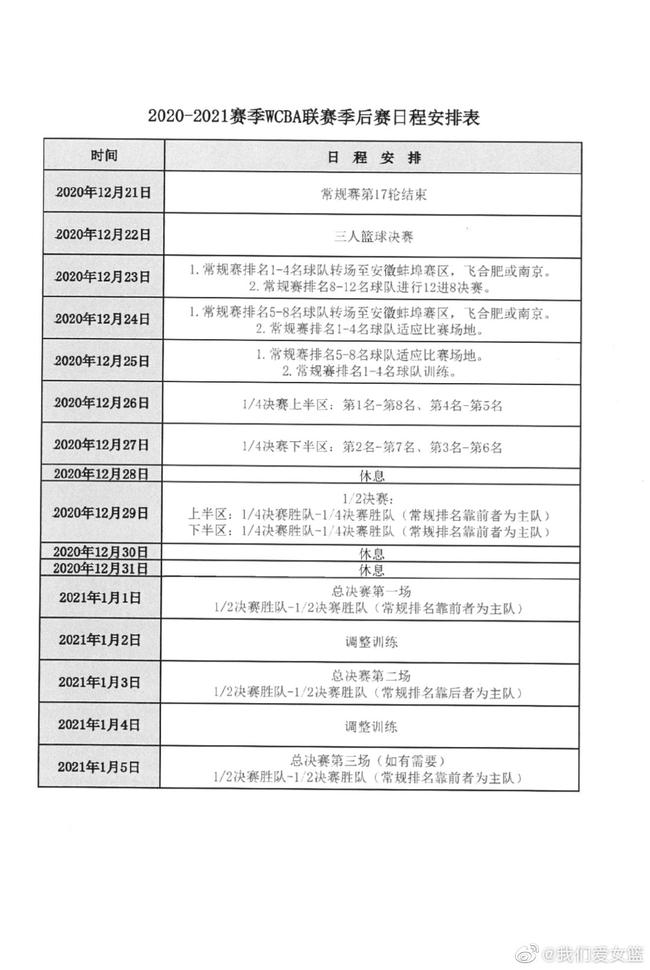 目前,WCBA常规赛第17轮正在进行,常规赛将于12月21日结束,12月22日将举办三人篮球决赛。季后赛赛程具体如下:12月26-27日,1/4决赛开打,12月29日半决赛开打,2021年1月1日总决赛第一场、1月3日总决赛第二场、1月5日总决赛第三场(如有需要)。
