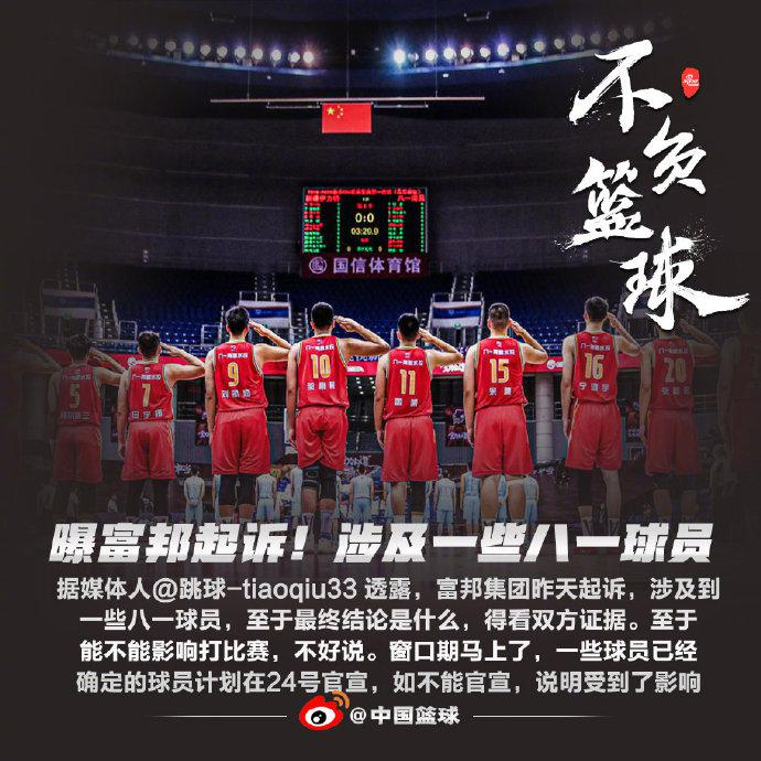 据篮球媒体人@跳球-tiaoqiu33 透露,富邦集团选择起诉对薄公堂,涉及到一些八一球员,至于最终结论是什么,得看双方证据。一些球员已经确定的球员计划在24日官宣,如果不能官宣,说明就受到了影响。