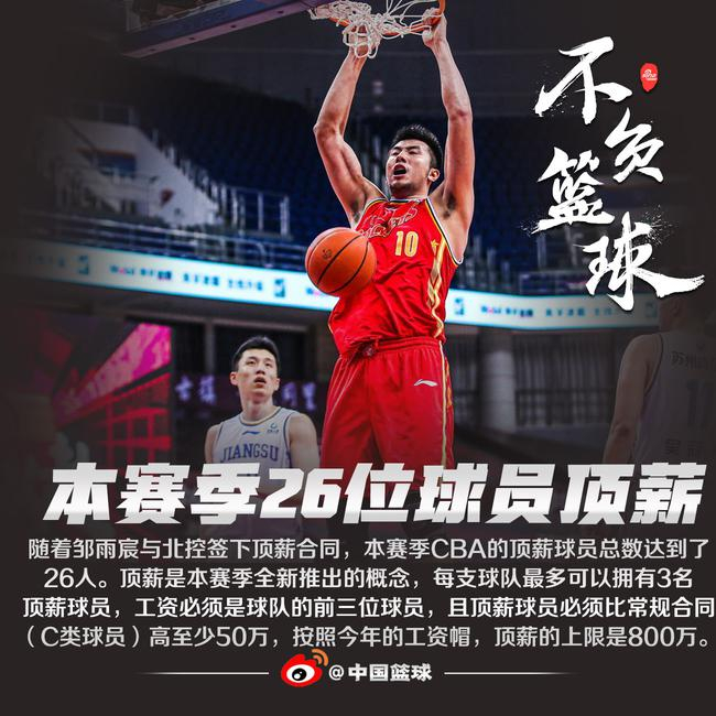 北京时间2月26日,随着邹雨宸与北控签下一份顶薪合同之后,本赛季CBA的顶薪球员一共达到了26位。