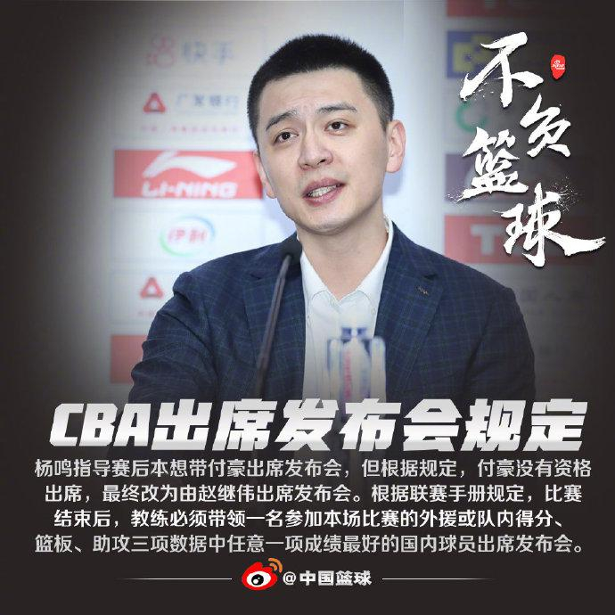 杨鸣指导赛后本来想带付豪出席发布会,但由于付豪得分篮板都是全队第二,不具备联赛手册规定的出席发布会的资格,最终由赵继伟顶替他,出席了发布会。杨鸣在发布会上质疑:“我觉得付豪是今天打得最好的,但是不让参加发布会,我特别不理解。”
