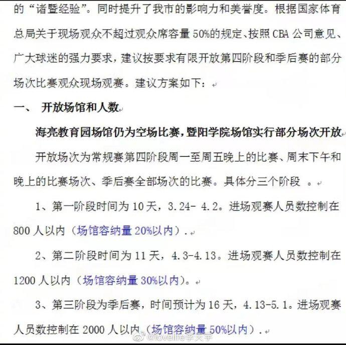 据篮球媒体人@lovelife李天宇 分享,诸暨市教体局发布CBA第四阶段开放场馆的建议,建议从CBA第四阶段开始分三个阶段逐步开放球迷入场,到季后赛时将有2000人以内的球迷能入场观赛。