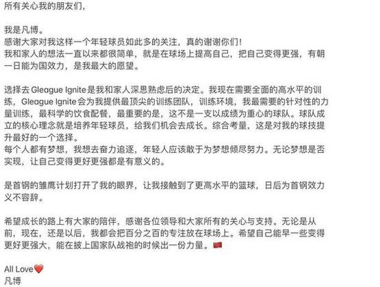 曾凡博25日在个人社交媒体上表示选择加盟点燃队,是自己与家人深思熟虑后的决定,同时他也解释了具体原因。同时,曾凡博也再次承诺日后返回首钢队效力是义不容辞的责任。曾凡博目前正在代表北京队出战全运会U19组别的预赛,之后他还将参加U22组的预赛。他未来的行程还要取决于他是否会被选入国家队集训。