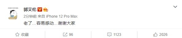 赛后,郭艾伦在个人微博中写道:“老了…容易感动…谢谢大家。”