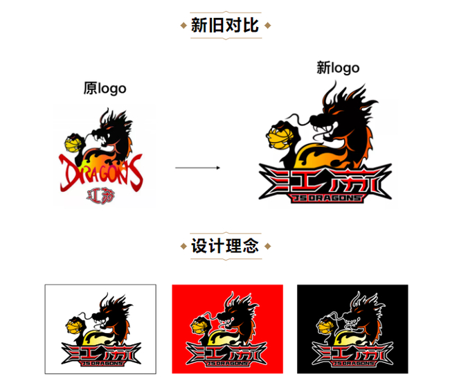 保留龙做为主元素,优化升级标识。标识配色保留了原logo颜色,优化了龙须、龙角、龙齿的表现形式。使整体标识更年轻化,且不脱离原logo风格。通过对龙形象的整体保留,来突出球队文化,传承球队不畏困难、积极进取的精神。
