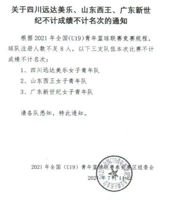 今年的U19青年联赛一共有17支报名队伍,这其中包括四川、山东、广东、重庆、内蒙、辽宁、陕西在内的7支女篮青年队因凑不够注册队员人数而被认定为不计成绩和名次。