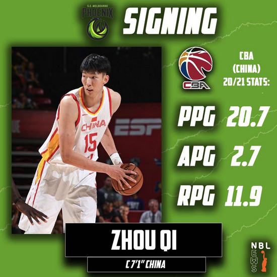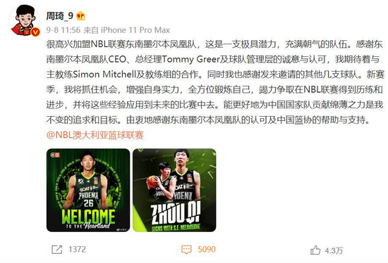 周琦在8月29日宣布退出下赛季CBA联赛后,只花了不到两周时间,就在微博上官宣了自己将加入澳大利亚NBL联赛的东南墨尔本凤凰队的消息。