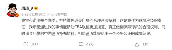 在8月29日的微博上,周琦写道:“我宣布退出整个赛季,坚持维护球员自身的合理合法权利,这是我作为球员应负的责任,我希望通过我的事情能够让CBA联盟更加规范,真正做到保障球员的合理权利,同时我会尽快向中国篮协补充材料,相信篮协能够给出一个公平公正的裁决结果。”