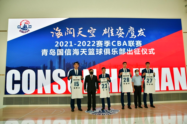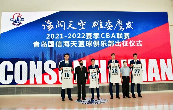 出征仪式上,青岛国信海天篮球俱乐部总经理张北海介绍了球队新赛季的准备工作,表达了对关心俱乐部发展的社会各界人士的感谢与敬意,并表示新赛季青岛男篮将持续发力,以历史成绩为新的起点,“归零”再出发,球队上下将秉承“团结、正义、拼搏、尊重、科学”的俱乐部精神,全力以赴,不负期待!丛培科、王建辉为新入队的张祖铭、王洪、李原宇、吕俊虎颁发了新赛季战袍。主教练吴庆龙从青岛国信集团党委书记、董事长王建辉手上接过球队队旗,预示着2021-2022赛季CBA联赛即将正式拉开战幕。