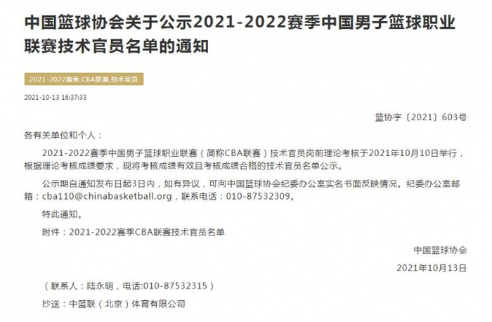 北京时间10月18日,中国篮协公布新赛季CBA联赛技术官员名单。