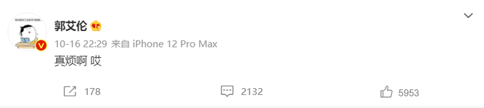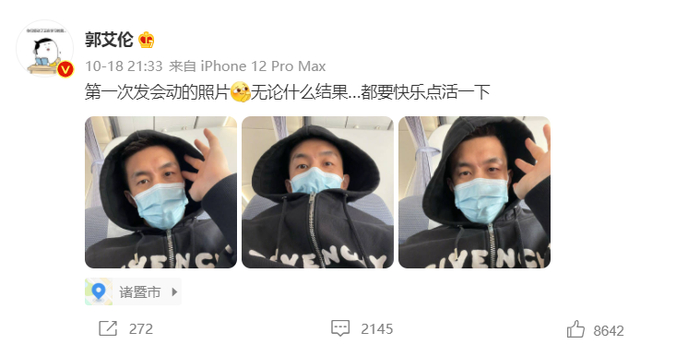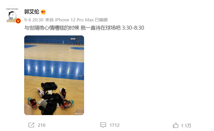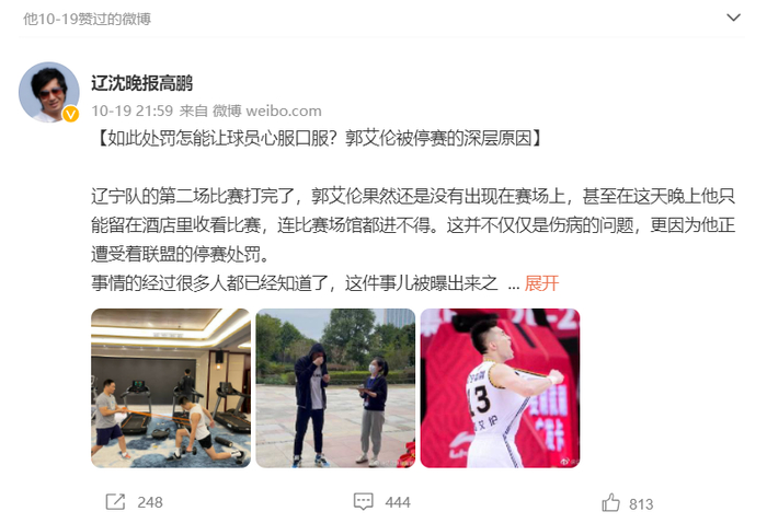 10月16日,辽宁首战前一天,郭艾伦在微博上写道:“真烦啊!哎。”两天后他再次发声:“无论什么结果。。。。。。都要快乐。”一天后辽宁队第二场CBA比赛,郭艾伦发布了在酒店独自训练的照片并写下“磨练”二字。