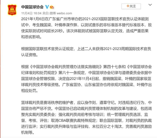撤销国家级裁判资格,对这两位CBA裁判来说绝对算是重罚了,新华社刊文表示:中国篮协用重拳处罚维护了中国篮球的声誉!这两位裁判到底干了什么?从篮协的通报来看,在今年1月份国际级裁判考试中,叶楠和魏国梁在体能测试串谋作弊!