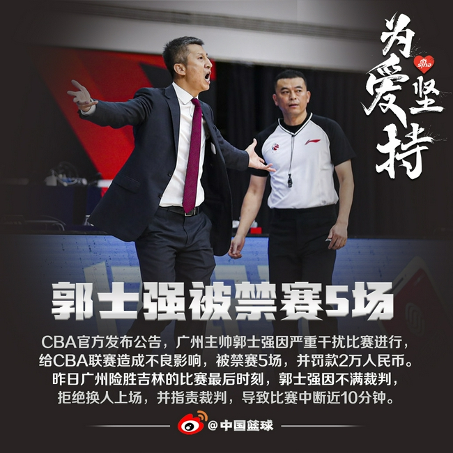 郭士强因为在广州与吉林最后时刻指责裁判,并拒绝换人上场,导致比赛中断。被CBA官方以严重干扰比赛进行,给CBA联赛造成不良影响的理由,处以禁赛5场,并罚款2万人民币的处罚。