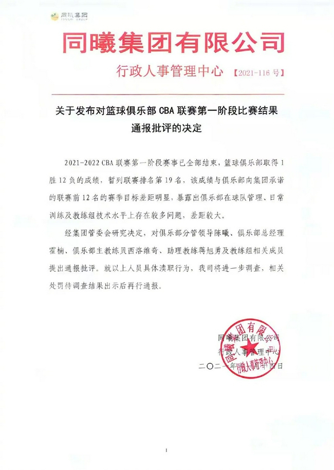 同曦只在赛季初期赢了宁波一场,在最后一轮主将西热力江伤停之后,惨败给同曦,10连败结束了第一阶段。同曦集团甚至直接在官网上公告批评了球队的糟糕表现,并表示将对球队管理层和教练组的具体渎职行为进行追责处罚。