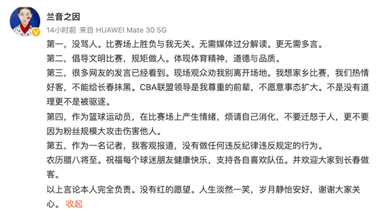 同时,她也表示,现场观众也在劝她不要离开场地,因为自己并没有做任何违反纪律违反规定的行为,而她离开场地是因为自己尊重作为前辈的CBA联盟领导,不想把事态扩大,并非理亏。