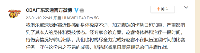 广东男篮官方写道:“近期感到身体极度不适,加之脚踝的伤势日趋加重,严重影响到了其本人的身体和竞技状态。经专家会诊方案,赵睿将休养和治疗一段时间,待伤病情况好转后归队。我们也将竭尽全力完成好赵睿不在队伍这段时间的比赛任务,守住这份来之不易的成果,期待赵睿早日康复跟兄弟们并肩作战。 ”