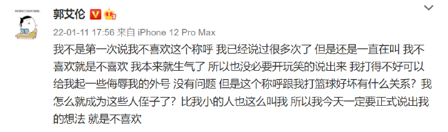郭艾伦写道:“我不是第一次说我不喜欢这个称呼,我已经说过很多次了,但是还是一直在叫。我不喜欢就是不喜欢,我本来就生气了,所以也没必要开玩笑的说出来,我打得不好可以给我起一些侮辱我的外号,没有问题,但是这个称呼跟我打篮球好坏有什么关系?我怎么就成为这些人侄子了?比我小的人也这么叫我,所以我今天一定要正式说出我的想法,就是不喜欢。”