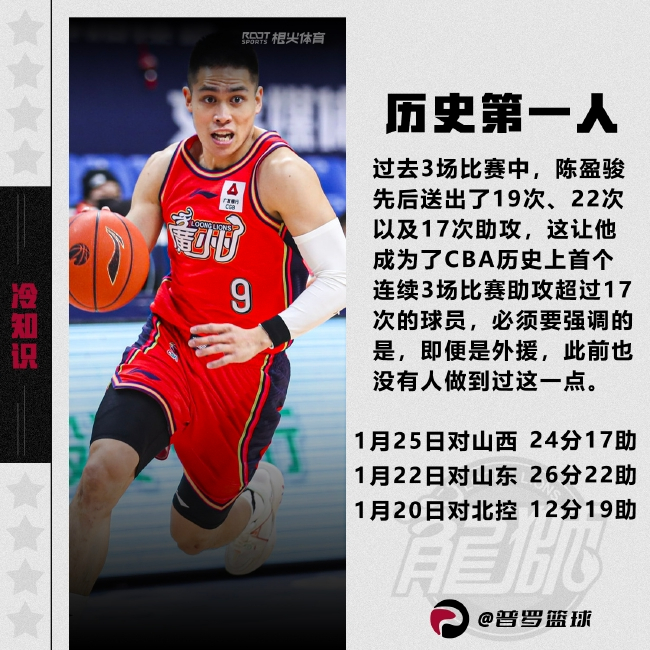 据普罗篮球统计 ,陈盈骏成为了CBA历史上第一位连续三场至少送出17次助攻的球员。