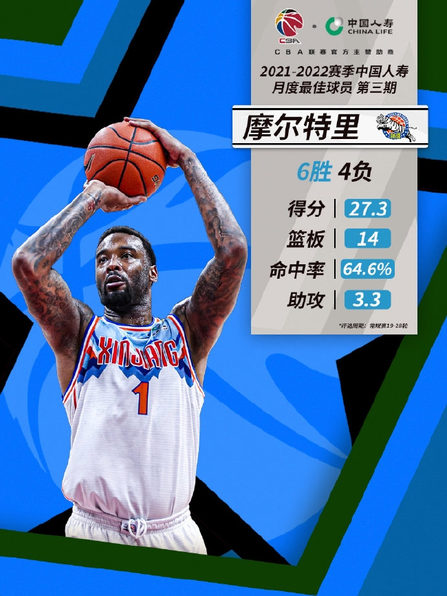 在第19-28轮比赛中,摩尔特里场均得到27.3分14篮板3.3助攻,命中率64.6%,帮助新疆取得6胜4负的战绩。