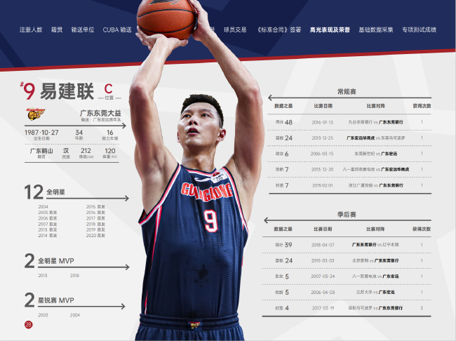 34岁的易建联已在CBA效力16个赛季。生涯最高分48分,篮板最高24个,助攻最多6次,抢断最多7次,封盖最多7次。