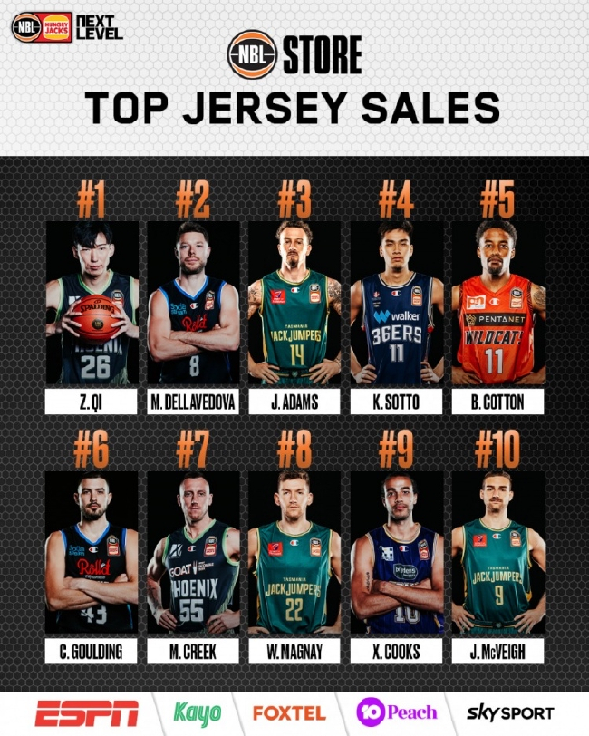 球衣销量排名前十的球员为:周琦、德拉维多瓦、约什-亚当斯、凯-索托、布莱斯-科顿、克里斯-古尔丁、米切尔-克里克、威尔-马格内、泽维尔-库克斯、杰克-麦克维。