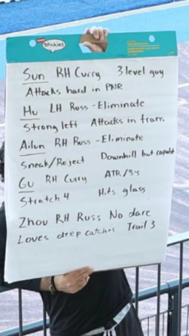 对于中国队的后卫群,阿拉巴马大学队还用“Russ(威少)”和“Curry(库里)”提醒球员他们的特点,擅长投射还是突破,中国队球员的惯用手也用“RH(右手)”和“LH(左手)”清楚的标注出来。