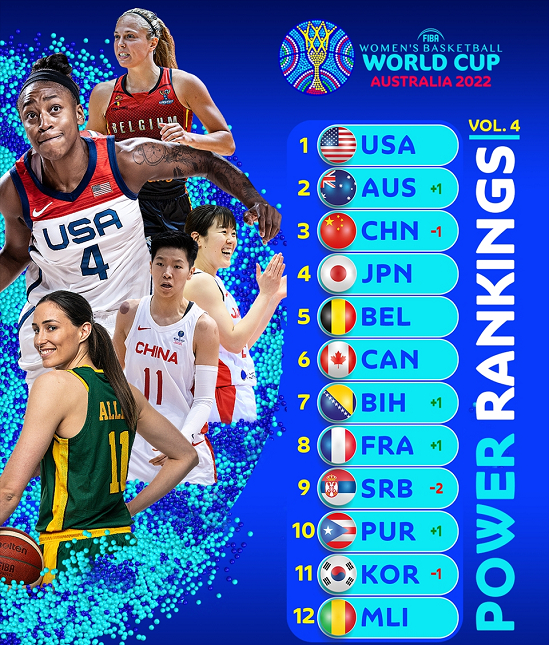 中国女篮在上一期的实力排行榜中,位列第二位。本次实力榜中,第二位被澳大利亚女篮占据。日本女篮则是继续保持在第四的位置。